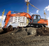 Экскаватор DOOSAN DX190WA с вместительным ковшом шириной 112 см и объемом 0,81 м³. Предназначен для погрузочных работ, а также копания грунта, песка, щебня и других материалов на глубину до 595 см. Применяется на строительных, сельскохозяйственных и дорожно-ремонтных объектах.